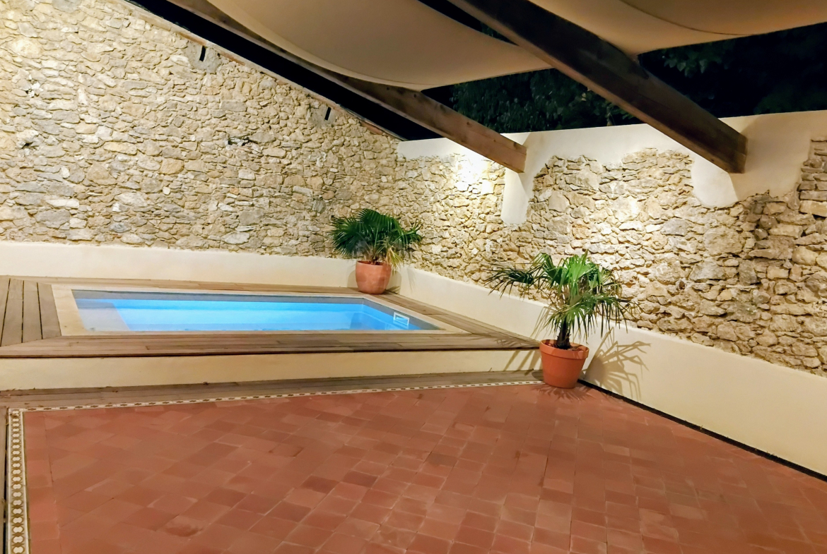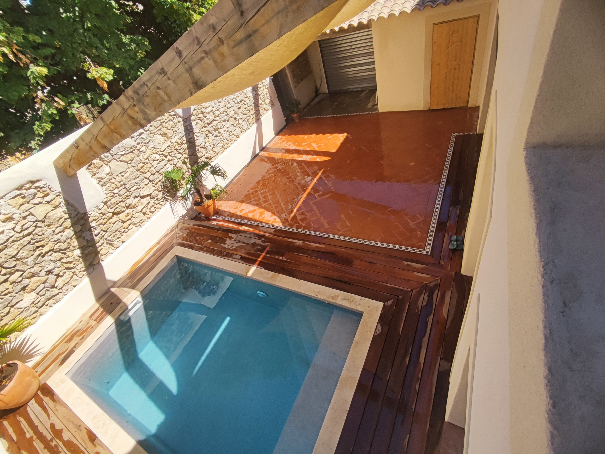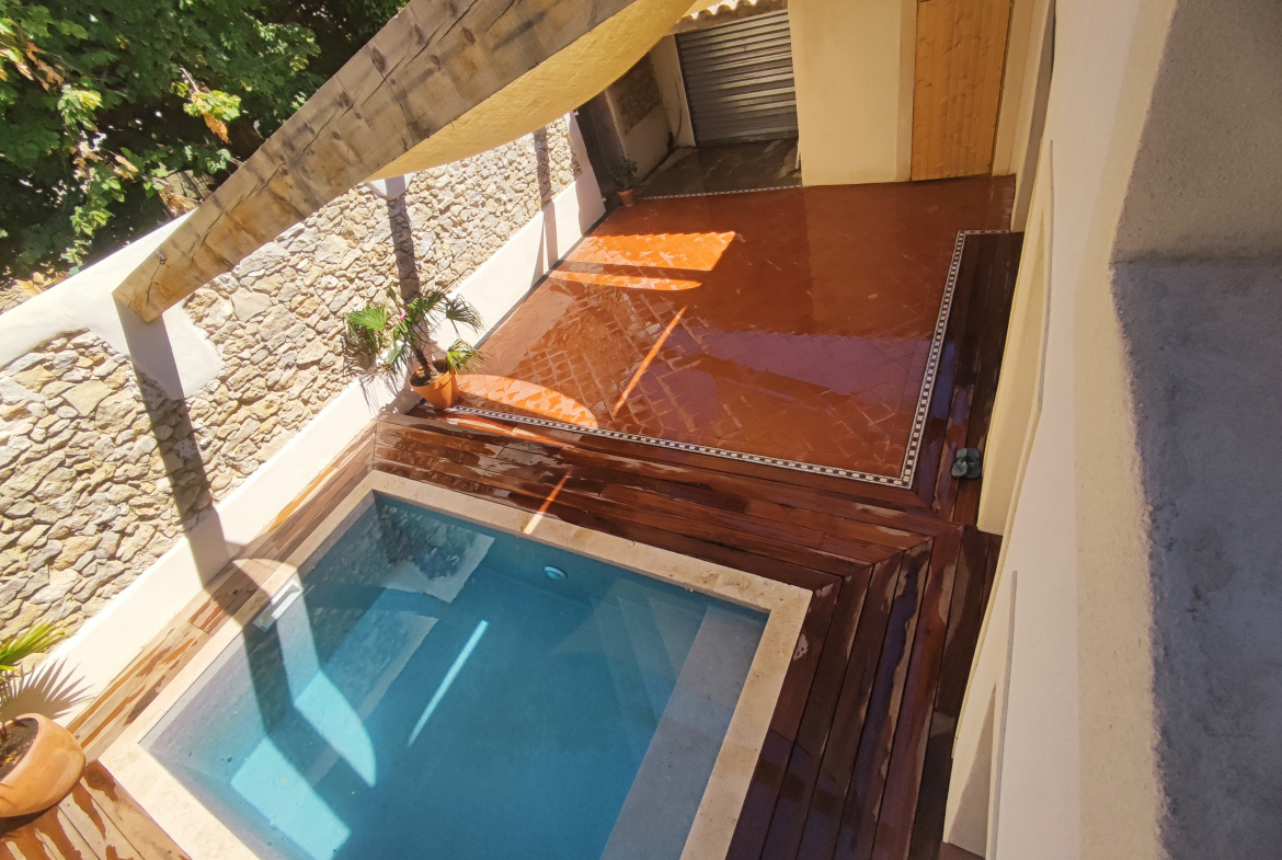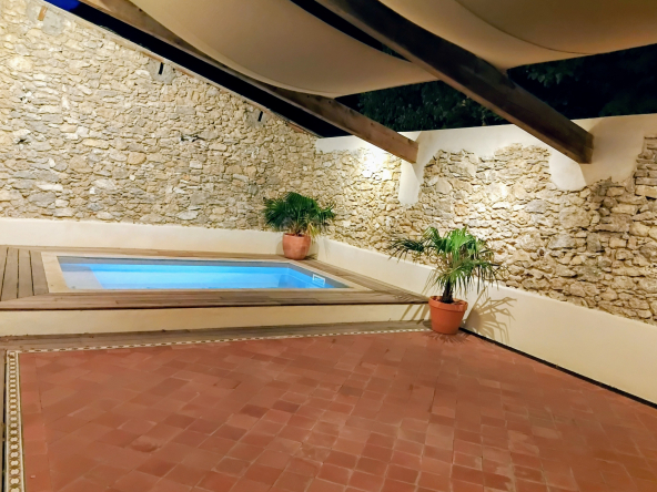 Der Außenbereich (80 m²) umfasst eine Zufahrt für Autos, einen Abstellraum (8 m²) und einen Swimmingpool (4 x 2,5 m) mit automatischer Elektrolysebehandlung und Wärmepumpe.