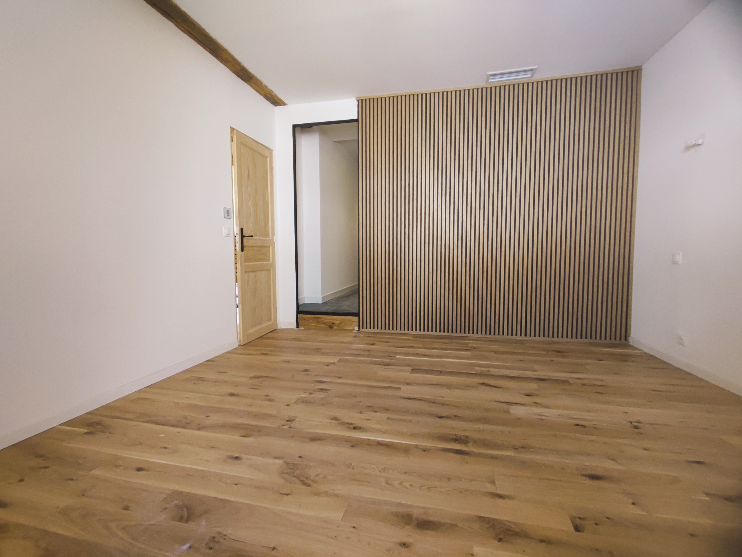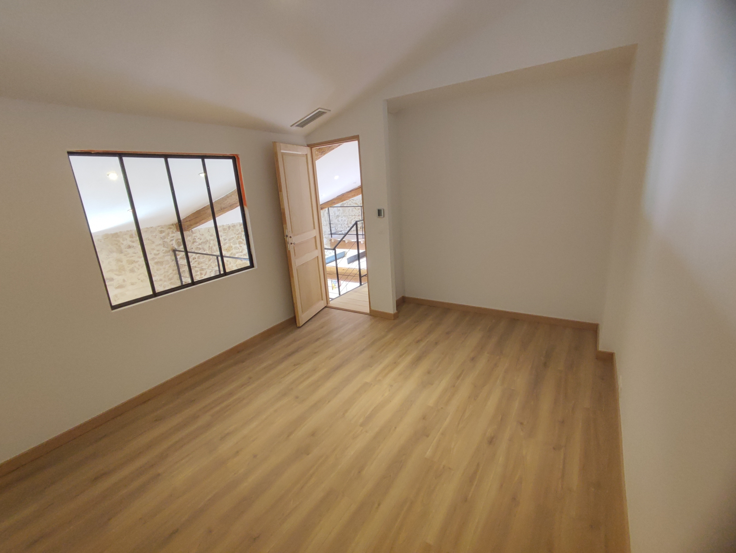 Im Erdgeschoss öffnet sich eine voll ausgestattete, halboffene Küche zu einem 45 m² großen Wohnzimmer mit Kathedralendecke und Südostausrichtung, das durch eine große Fenstertür auf einen privaten Außenbereich ohne Gegenüber blickt.