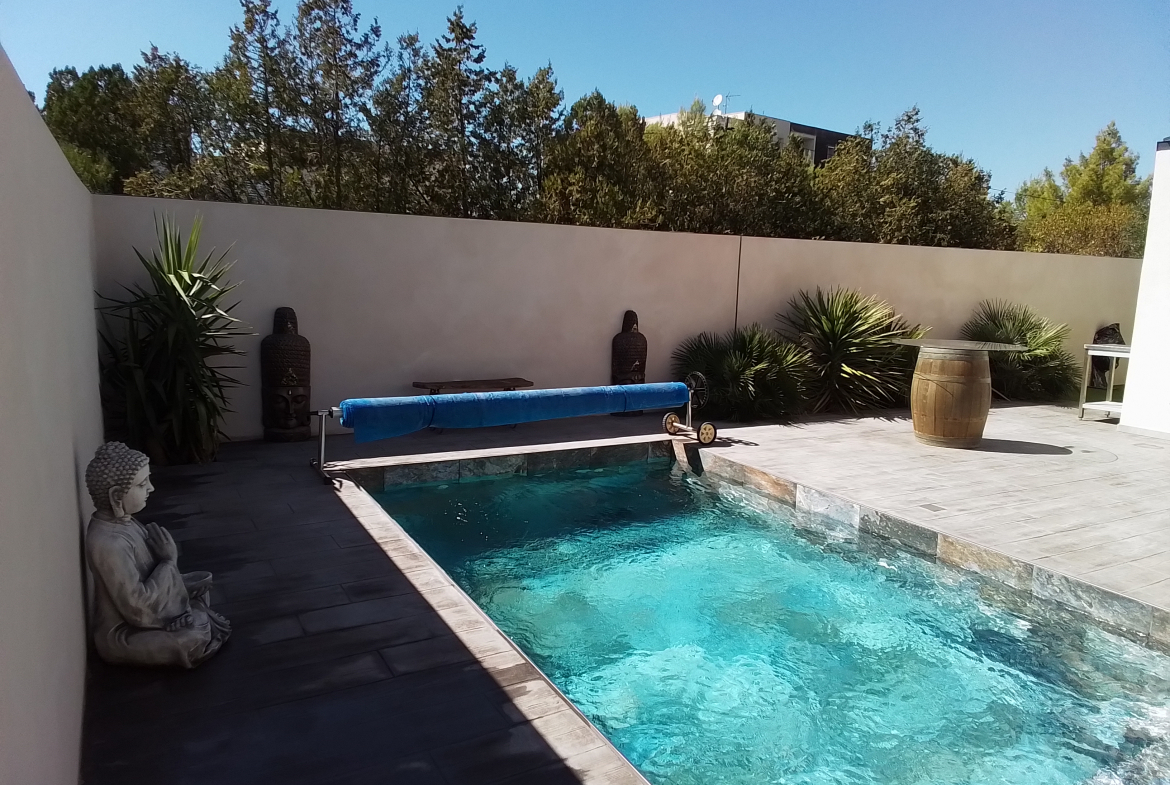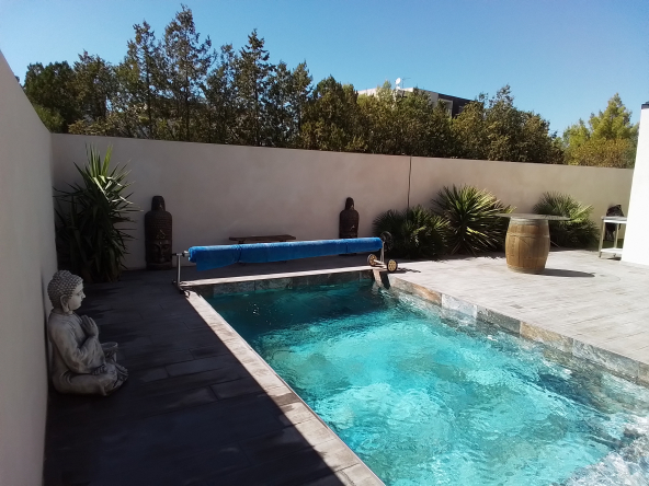 Zusätzlich gibt es eine Garage mit 28 m². Das Grundstück umfasst 390 m² und ist mit einem Pool ausgestattet – ideal, um das mediterrane Klima zu genießen. Ein automatisches Bewässerungssystem erleichtert die Pflege des Außenbereichs.